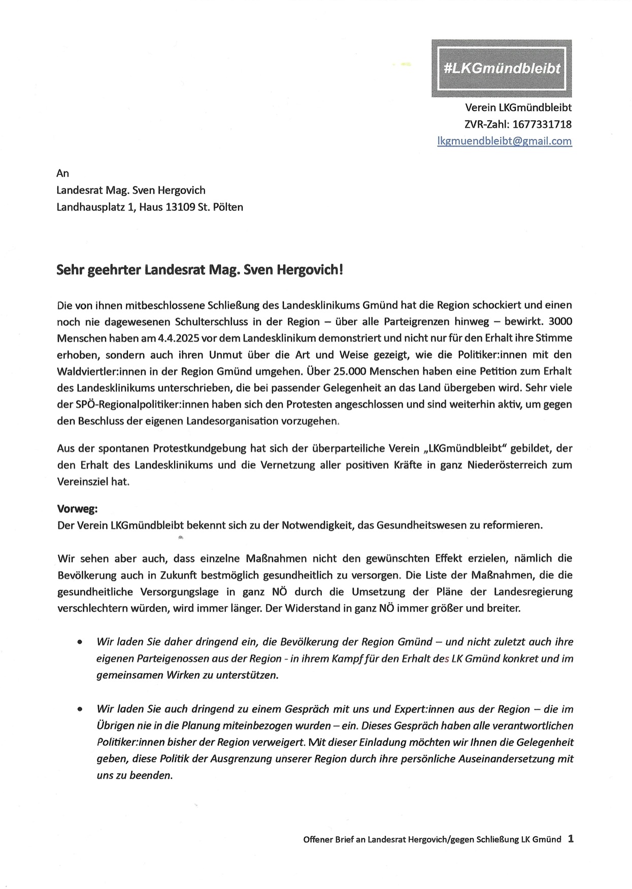Bei einem Treffen am 9.9.2025 mit dem niederösterreichischen Landesrat Sven Hergovich übergibt #zusammenHaltNÖ den Offenen Brief des Vereins „LKGmündbleibt“. In diesem Brief wird der Landesrat zu einem Gespräch über bessere Lösungen nach Gmünd eingeladen und er wird aufgefordert, sich für den Erhalt des Landesklinikums Gmünd einzusetzen.